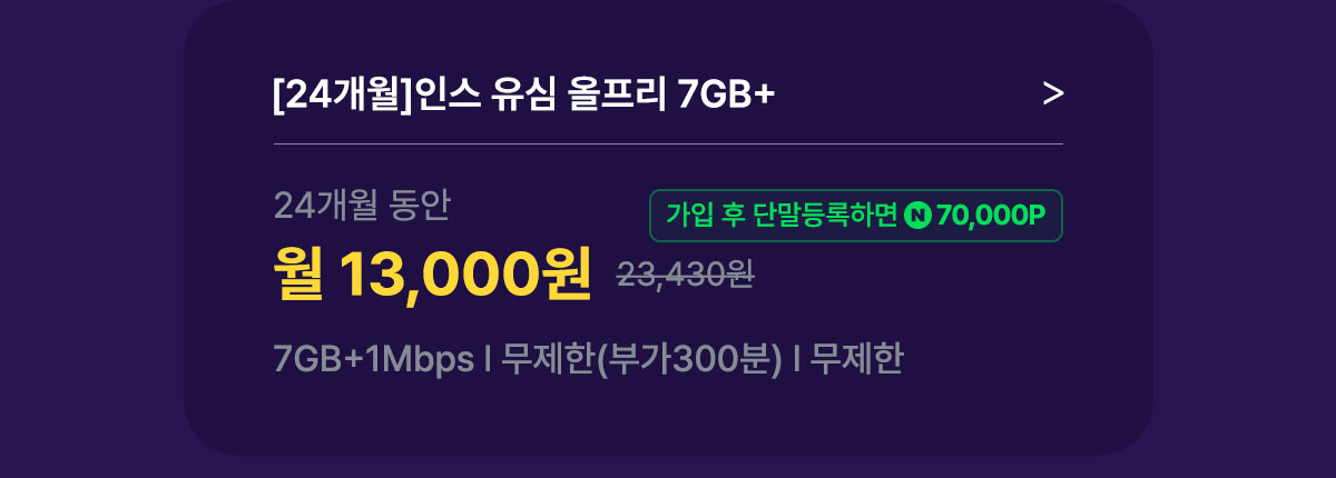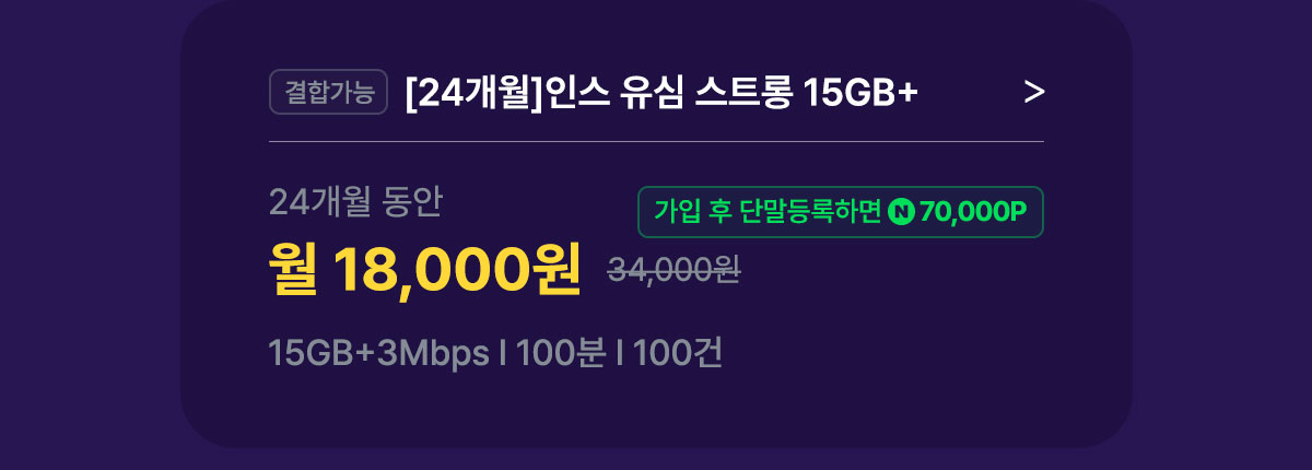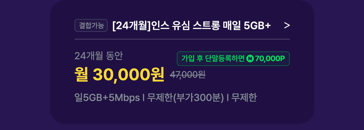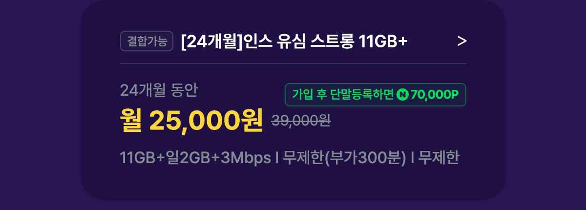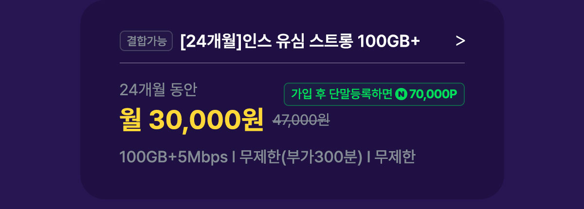 [24개월] 인스 유심 올프리 7GB+ [24개월] 인스 유심 스트롱 15GB+ [24개월] 인스 유심 스트롱 11GB+ [24개월] 인스 유심 스트롱 매일 5GB+ [24개월] 인스 유심 스트롱 100GB+ 위 요금제로 개통 하신 고객님은 네이버페이 70,000원이 증정되며, 모바일 상품권은 개통하신 번호로 25년 12월 30일(화) 이후 순차 발송됩니다.