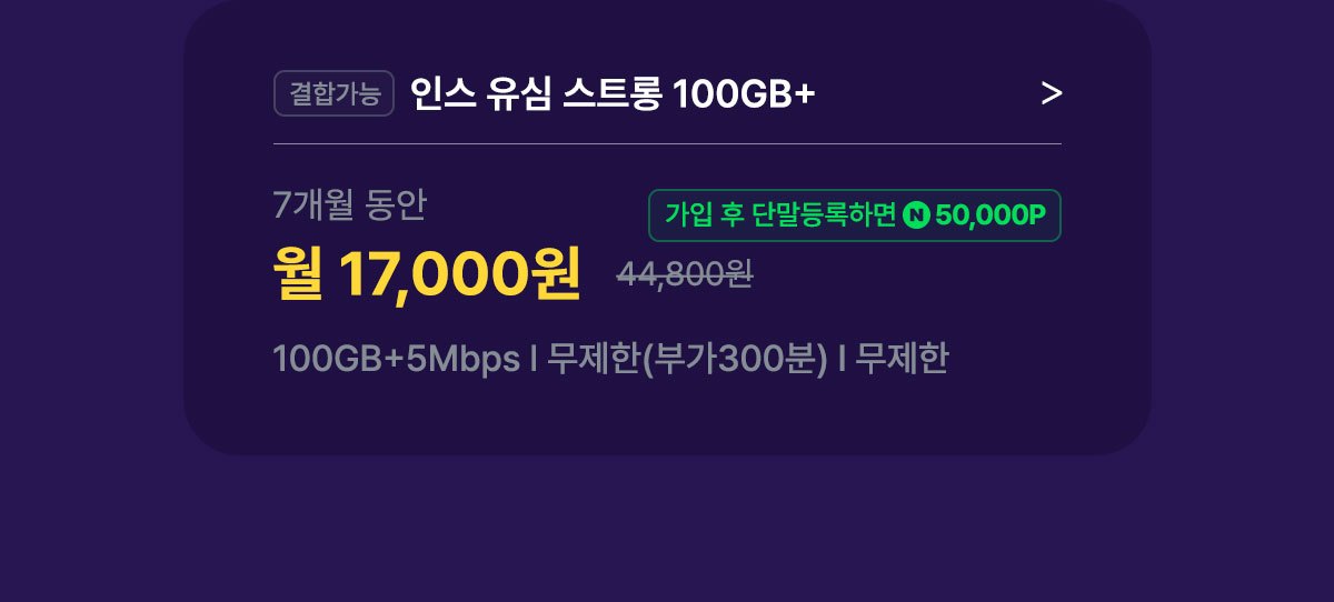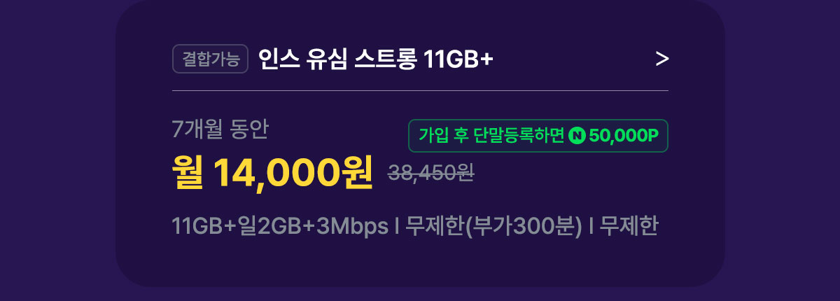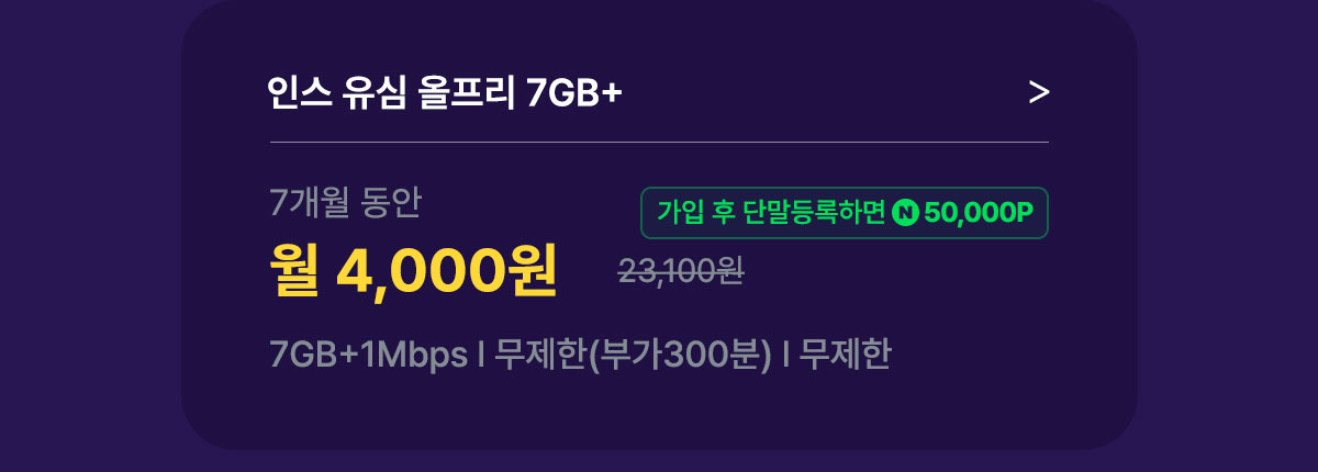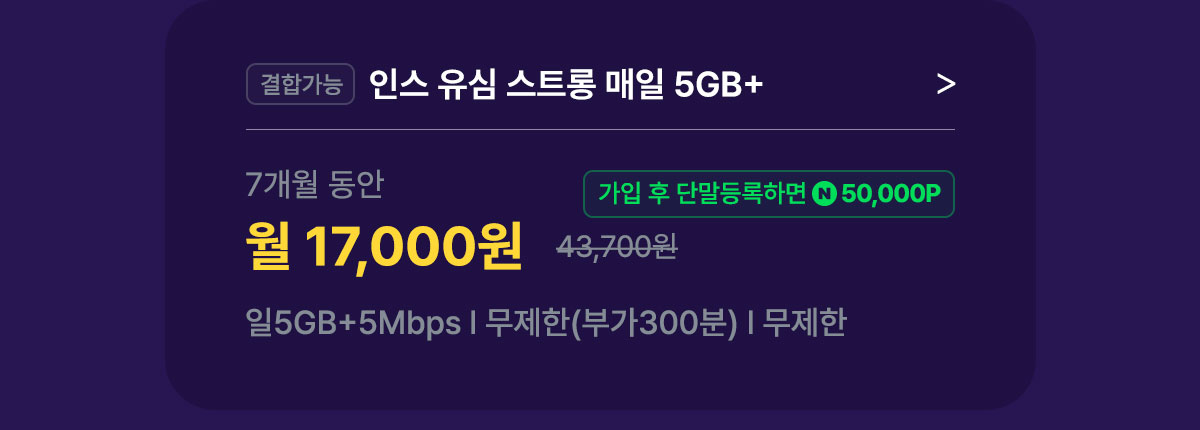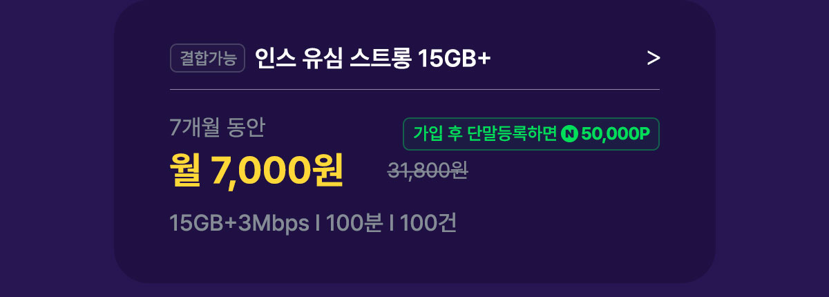 [7개월] 인스 유심 올프리 7GB+ [7개월] 인스 유심 스트롱 15GB+ [7개월] 인스 유심 스트롱 11GB+ [7개월] 인스 유심 스트롱 매일 5GB+ [7개월] 인스 유심 스트롱 100GB+ 위 요금제로 개통 하신 고객님은 네이버페이 50,000원이 증정되며, 모바일 상품권은 개통하신 번호로 25년 12월 30일(화) 이후 순차 발송됩니다.