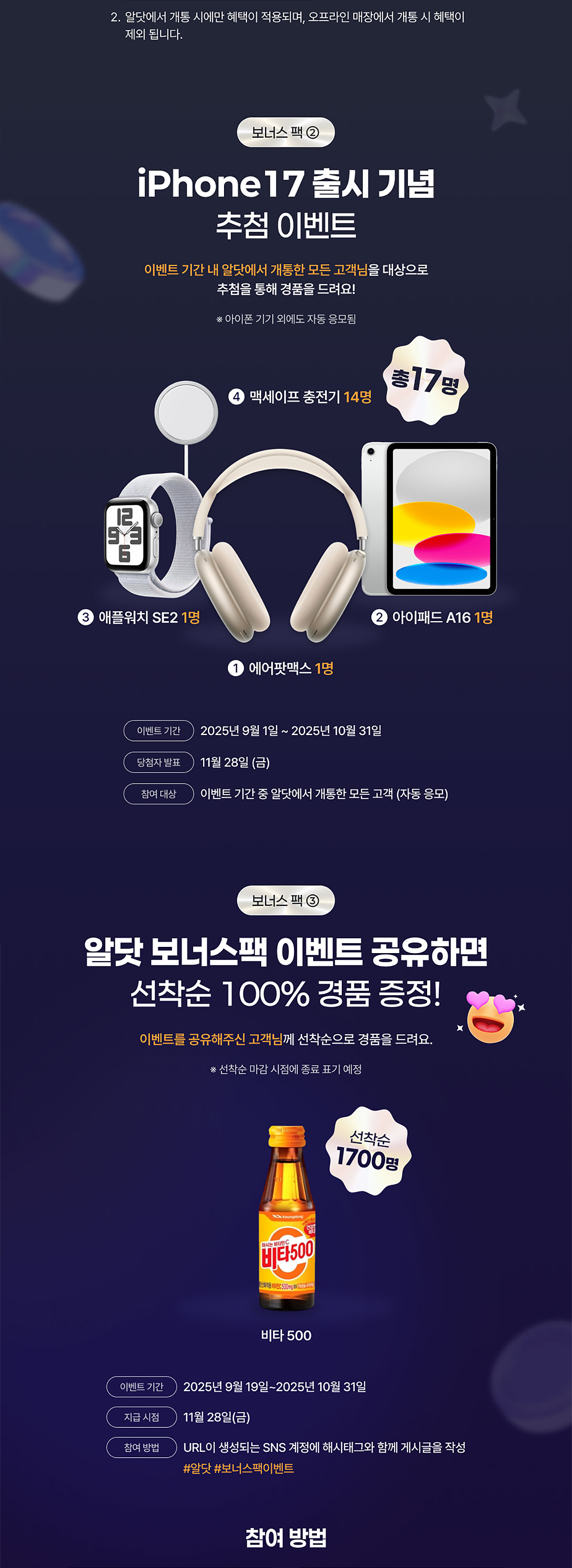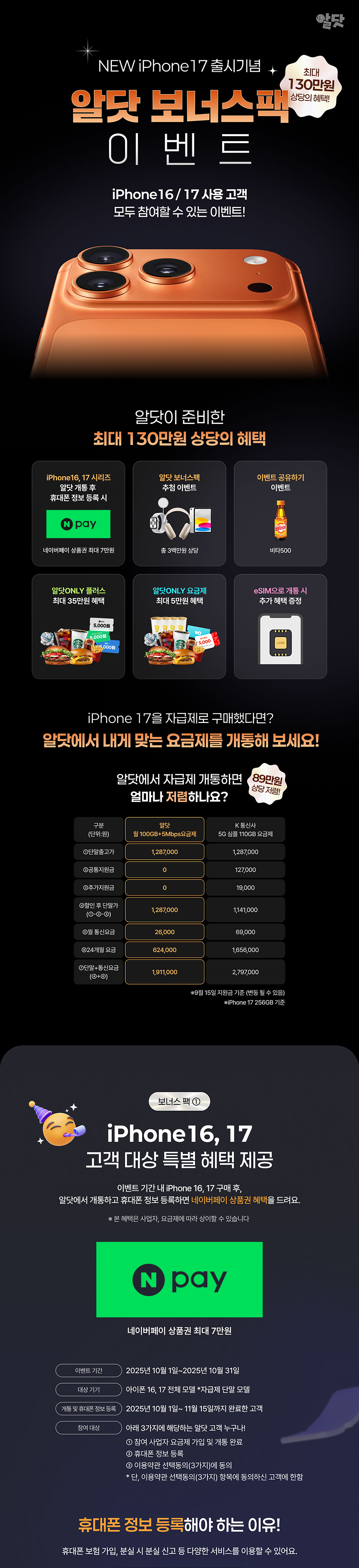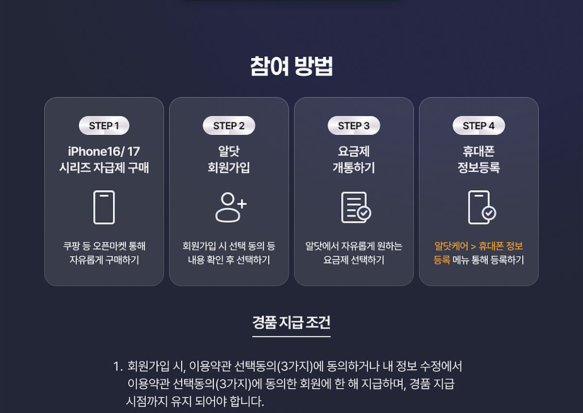 본 이벤트는 9월 19일부터 9월 30일까지 자급제로 구매하신 iPhone17(iPhone17, iPhone 17 Pro, iPhone 17 Pro Max, iPhone 17 Air) 및 iPhone16(iPhone16, iPhone16 Pro, iPhone16 Pro Max, iPhone16 Plus, iPhone16e)단말로 셀프개통을 완료한 후 알닷 셀프케어 메뉴에서 휴대폰 등록을 완료한 고객을 대상으로 진행됩니다.
