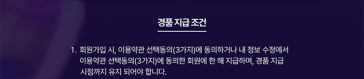 회원 가입 시 이용약관 선택동의(3가지)에 동의하거나 내 정보 수정에서 이용약관 선택동의(3가지) 동의한 회원에 한해 지급하며 쿠폰 지급 시점까지 유지되어야 합니다.