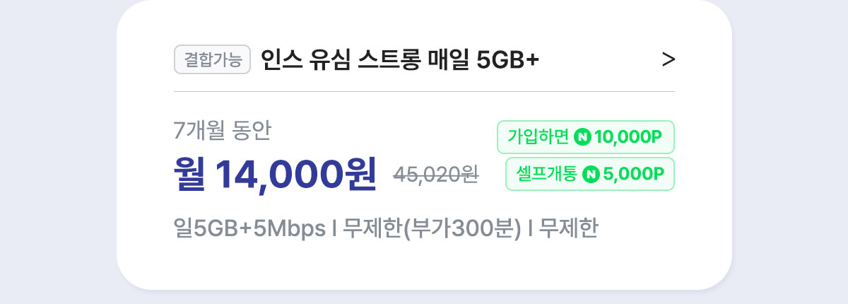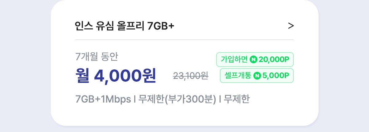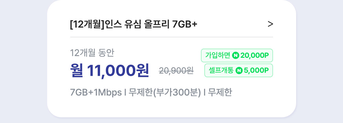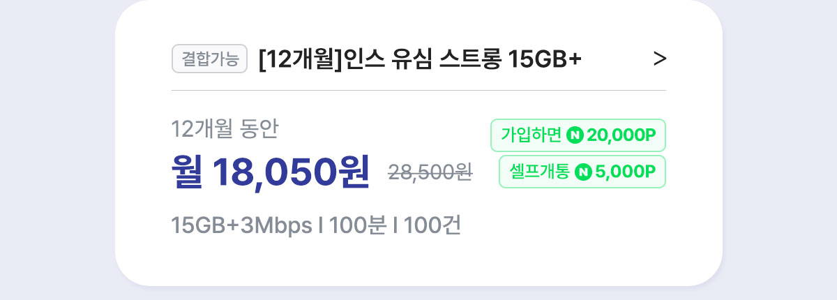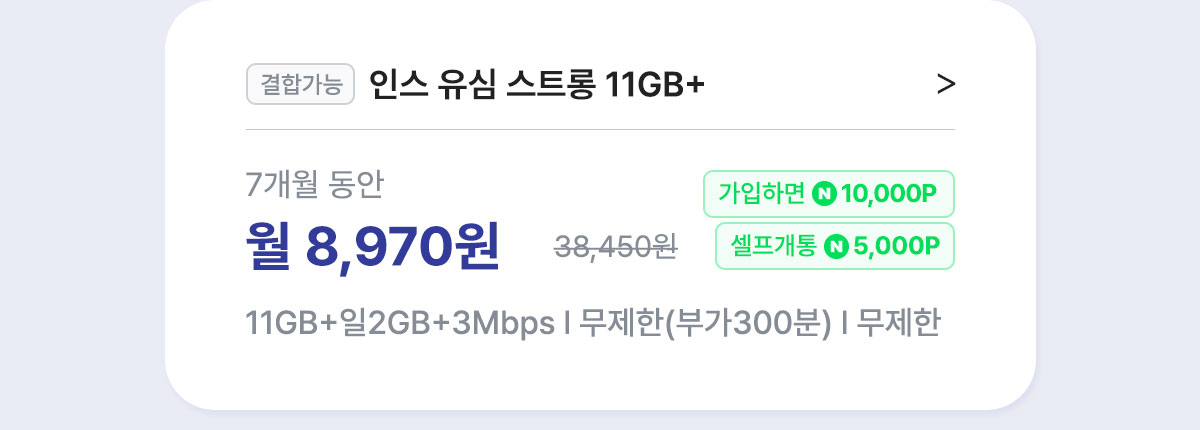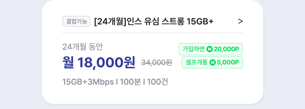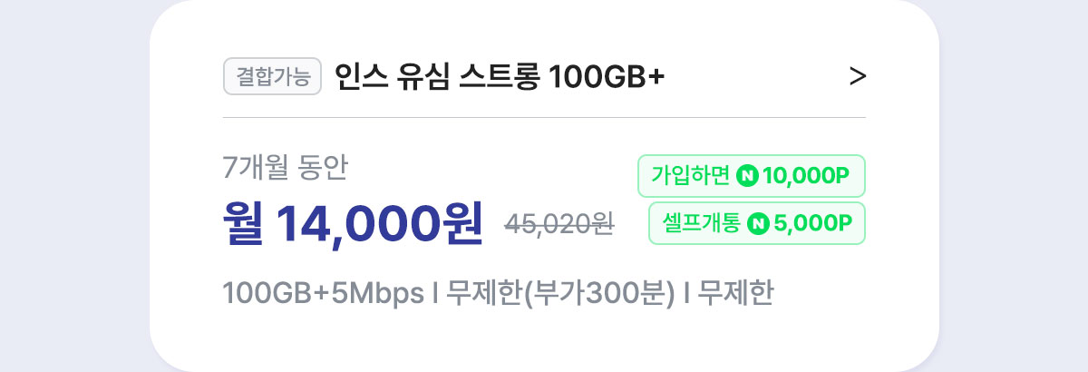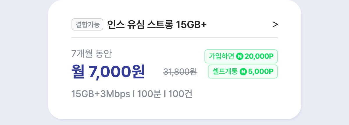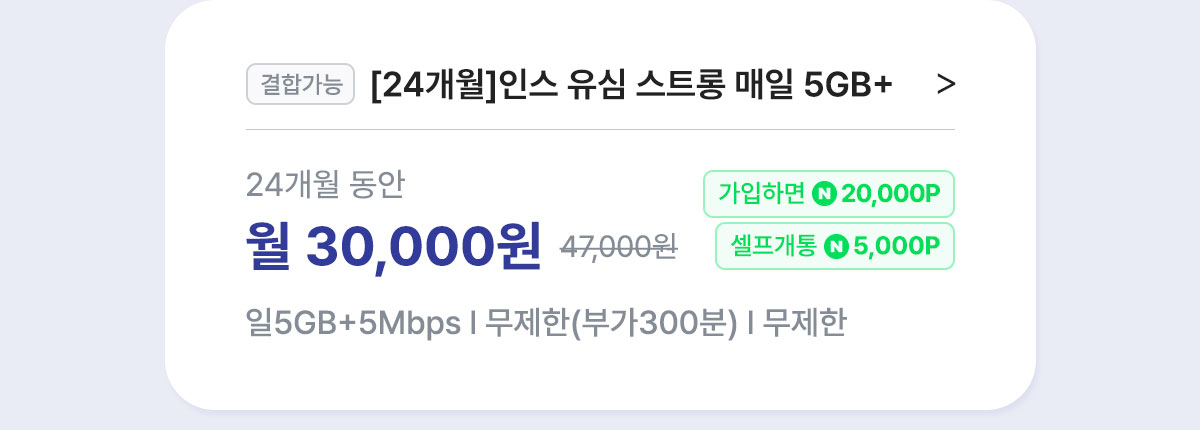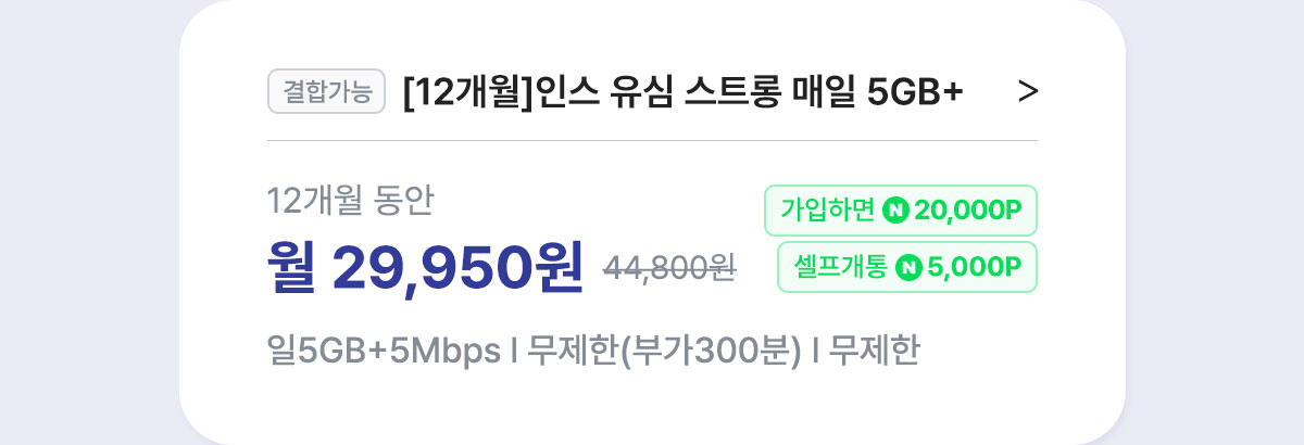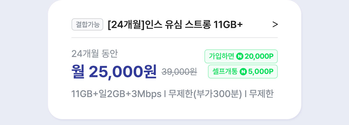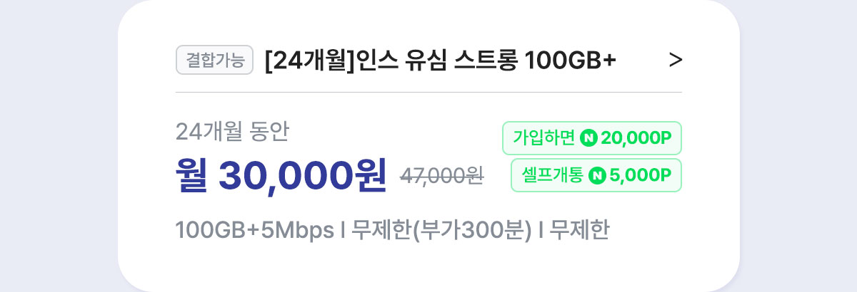[7개월/12개월/24개월] 인스 유심 올프리 7GB+ [7개월/12개월/24개월] 인스 유심 스트롱 15GB+ [7개월/12개월/24개월] 인스 유심 스트롱 11GB+ [7개월/12개월/24개월] 인스 유심 스트롱 매일 5GB+ [7개월/24개월] 인스 유심 스트롱 100GB+