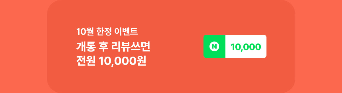 25년 10월 15일 오후 6시 이후로 위 요금제로 개통 하신 고객님은 네이버페이 10,000원이 증정되며, 모바일 상품권은 개통하신 번호로 26년 1월 30일(금) 이후 순차 발송됩니다.