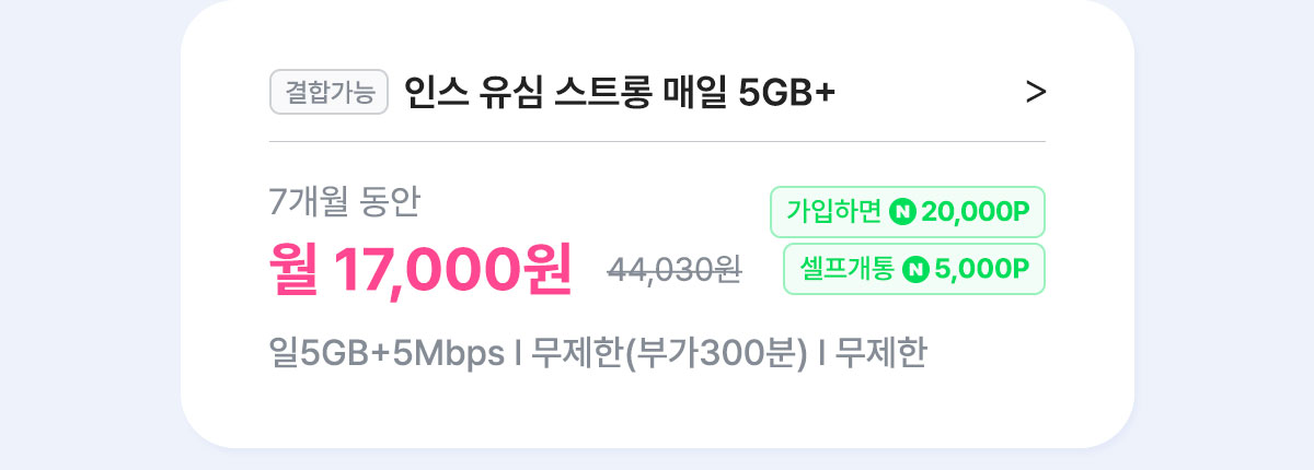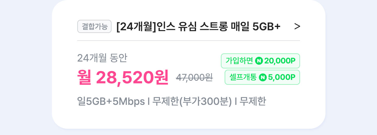[7개월/12개월/24개월] 인스 유심 스트롱 매일 5GB+