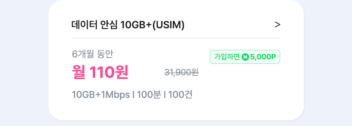 위 요금제로 개통 하신 고객님은 네이버페이 20,000원이 증정되며, 모바일 상품권은 개통하신 번호로 26년 5월 29일(금) 이후 순차 발송됩니다. - [6개월] 데이터 안심 10GB+(USIM)