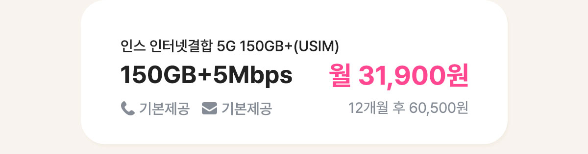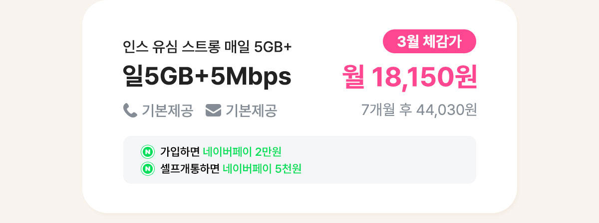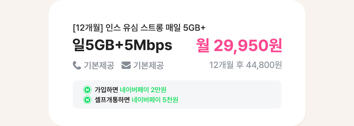[7개월/12개월/24개월] 인스 유심 스트롱 매일 5GB+
