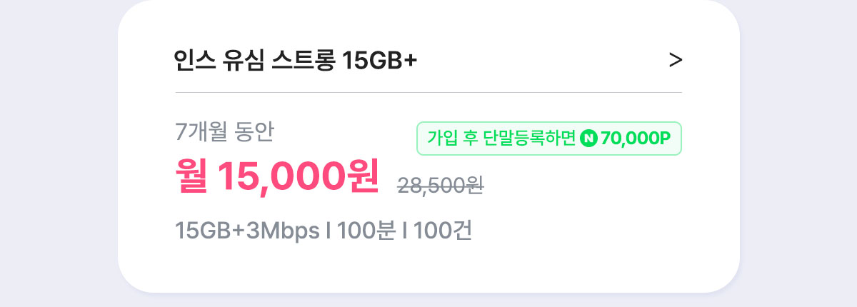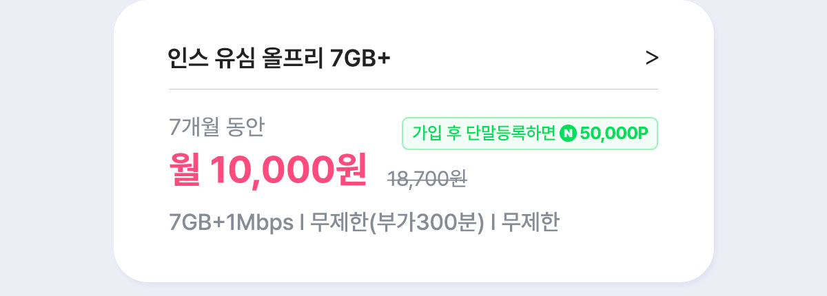 위 요금제로 개통 하신 고객님은 네이버페이 50,000원이 증정되며, 개통 익월말부터 매월 말일마다 월 1만원X5회 지급됩니다. - [7개월] 인스 유심 스트롱 15GB+