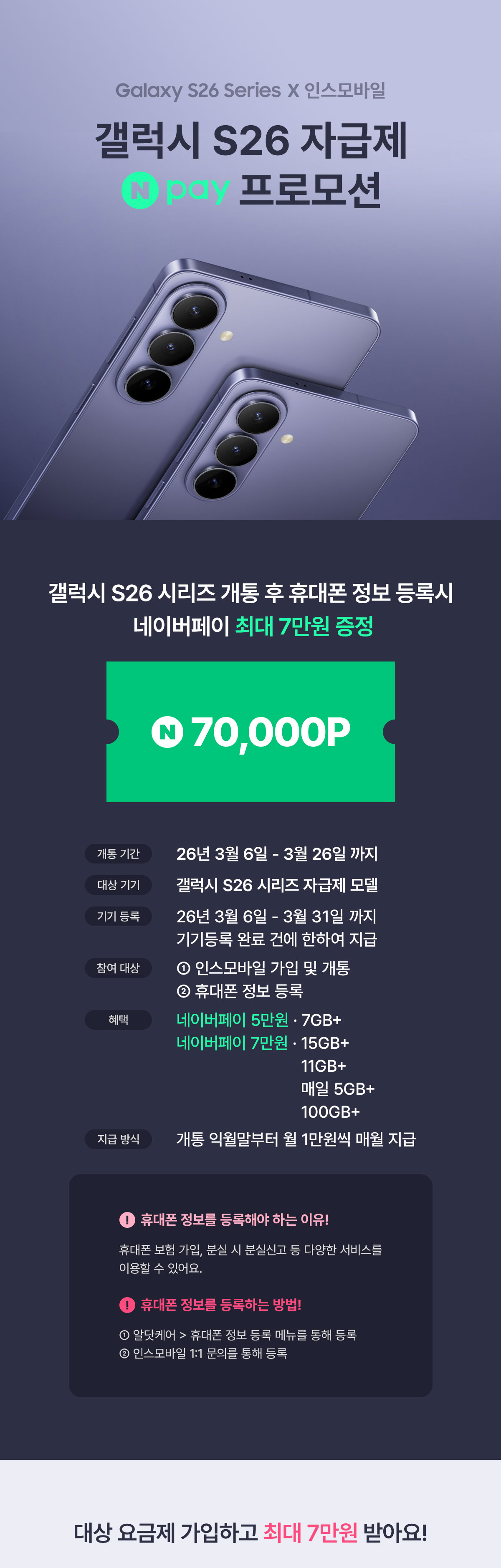 - 본 이벤트 요금제는 26년 3월 6일부터 3월 26일까지 개통완료 후 3월 31일까지 휴대폰 정보 등록을 완료한 고객을 대상으로 진행됩니다.